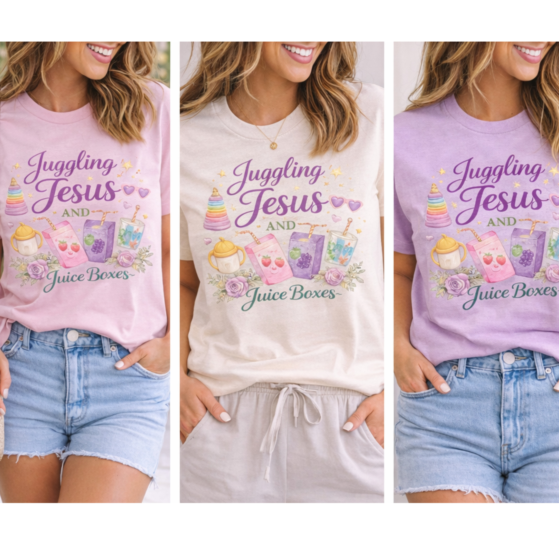 - Mama Shirt: “Juggling Jesus & Juice Boxes”